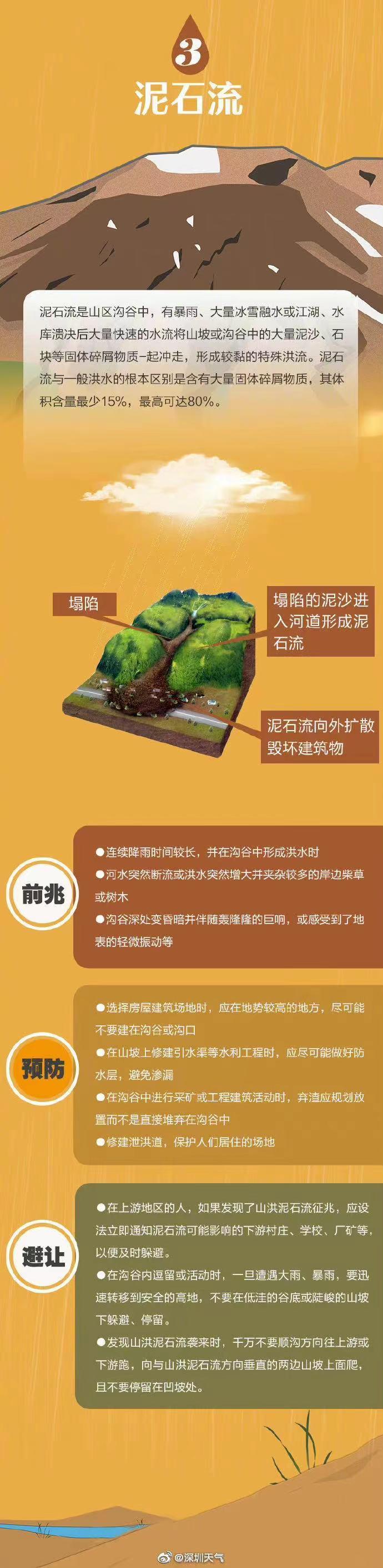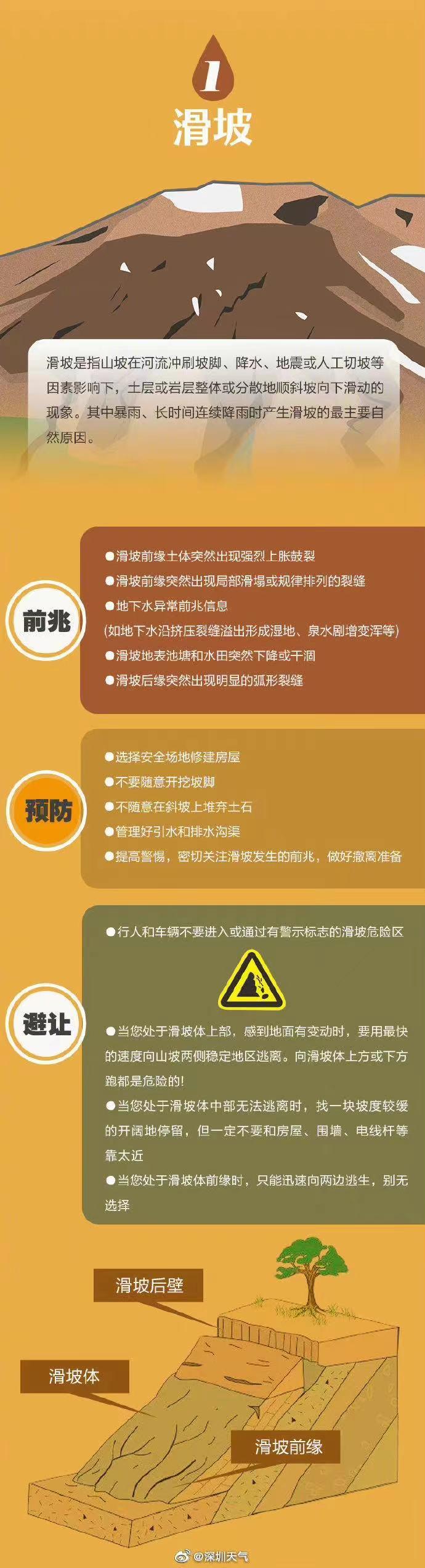 所以,深圳現(xiàn)已發(fā)布的地質(zhì)災(zāi)害氣象風險橙色預(yù)警,表示24小時內(nèi)地質(zhì)災(zāi)害發(fā)生的風險高。其中地質(zhì)災(zāi)害主要包括滑坡、崩塌和泥石流等。