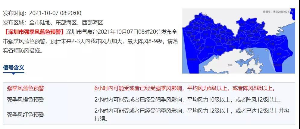 所以,深圳現(xiàn)已發(fā)布的強季風藍色預(yù)警,表示6小時內(nèi)可能受或者已經(jīng)受強季風影響,平均風力6級以上,或者陣風8級以上。