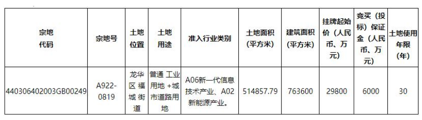 10月19日,據(jù)深圳公共資源交易中心網(wǎng)站顯示,華為以底價(jià)2.98億拿下位于龍華區(qū)的一塊普通工業(yè)用地,土地面積514857.79平方米,建筑面積763600平方米。相關(guān)信息顯示,該地塊用途為普通工業(yè)用地+城市道路用地,準(zhǔn)入行業(yè)類別為A02新能源產(chǎn)業(yè)、A06新一代信息技術(shù)產(chǎn)業(yè)。