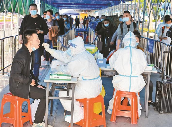 ▲10月25日,在深圳北站出站口,剛剛抵達深圳的旅客排隊接受免費核酸檢測。深圳晚報記者 陳玉攝