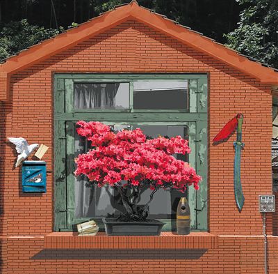 安徽省六安市霍山縣諸佛庵鎮(zhèn)丙烯壁畫《窗前的杜鵑花》,中國美術學院繪畫藝術學院師生集體創(chuàng)作。 |