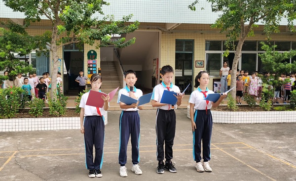 八點整,升國旗儀式正式開始。國旗護(hù)衛(wèi)隊邁著堅定的步伐走向升旗臺。鮮艷的五星紅旗在激昂雄壯的國歌聲中冉冉升起、迎風(fēng)飄揚,全體師生肅立注目,齊唱國歌。國旗下,教務(wù)處主任吳偉卿激勵每一位學(xué)生要感恩國家的付出,好好學(xué)習(xí),豐富知識,增長才干,長大后把祖國建設(shè)得更加強(qiáng)大。接著,六(1)班的四位同學(xué)以激情澎湃的詩朗誦《強(qiáng)國力量》向偉大的祖國致敬。他們把文字蘊(yùn)含的振奮人心、群情激昂、波瀾壯闊和自己內(nèi)心對偉大的黨和親愛的祖國的熱愛和自豪之情,展現(xiàn)得淋漓盡致,深入人心。