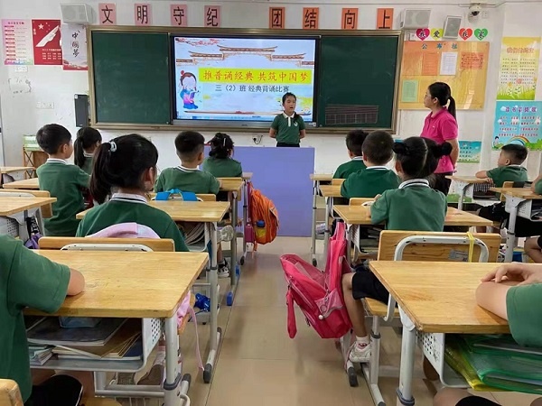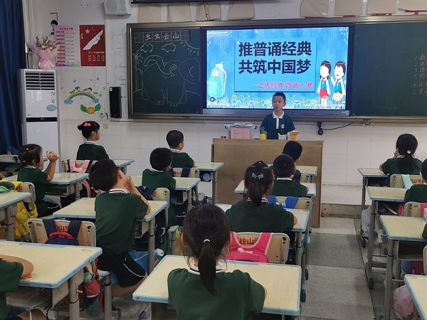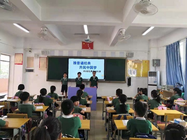 推普周里,五桂山學校一至六年級都開展了“推普誦經(jīng)典,共筑中國夢”的經(jīng)典誦讀大賽。一年級的同學童聲稚嫩,卻能瑯瑯上口誦讀著《大風歌》 《詠鵝》 《江南》等小學生必背的75首古詩,這也得益于學校一貫重視學生中華優(yōu)秀傳統(tǒng)文化的培養(yǎng)與傳承。中高年級的同學們自信滿滿地背誦著自己喜愛的古詩。詩詞大會的舉辦,讓同學們領悟到了中華詩詞的獨特魅力,領略到華夏文化的博大精深。更明白了說好普通話的重要意義,關注了普通話的標準發(fā)音,更嚴格地要求自己說話字正腔圓,提高了語言表達的能力,更加熱愛祖國的文字。