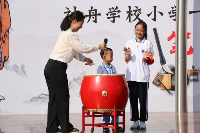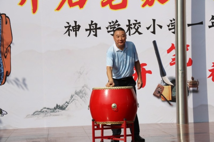 活動開始,一年級的新同學們就在父母的陪伴下穿過“智慧門”,進入會場。接著神舟學校德育處韋德敏主任宣布“開筆禮”活動正式開始。神舟學校高華副校長首先致詞,高華校長表示:今天我們結合時代的特點,古為今用,古今結合,并有所創(chuàng)新地舉行開筆禮儀式,目的就是想通過這種莊重的儀式,讓剛入學的一年級小朋友真正感受到入學是人生中的一件大事,是開始學習,走向成才的起點,要以此激勵同學們珍惜讀書機會、勤奮學習;同時又通過這種特別的方式弘揚我國優(yōu)良的傳統(tǒng)文化。高華校長講話結束后,主持人又組織大家依次開展了“正衣冠”、行“拜師禮”、點朱砂啟智、擊鼓明智及啟蒙描紅活動,這五個頗具歷史傳統(tǒng)意義的環(huán)節(jié),讓孩子們感受到了傳統(tǒng)文化的魅力。