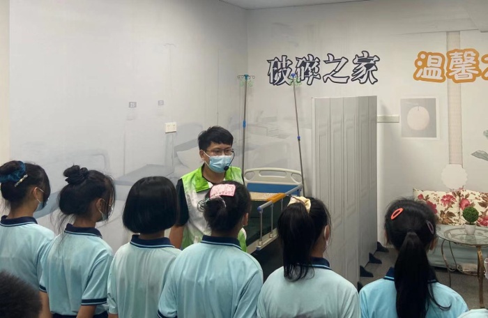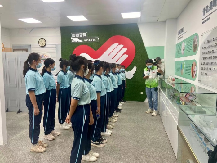 接著,同學(xué)們?cè)诮巨k梁社工的帶領(lǐng)下,來(lái)到模擬KTV、監(jiān)獄實(shí)地等感受吸毒帶來(lái)的巨大危害。隨后,全體同學(xué)進(jìn)行禁毒宣誓,堅(jiān)決牢記歷史使命,弘揚(yáng)硝煙精神,自覺(jué)抵制毒品誘惑。最后,全體學(xué)生觀看禁毒視頻,直觀、詳實(shí)的內(nèi)容介紹,讓孩子們更加直觀地了解毒品以及吸食毒品帶來(lái)的危害性。