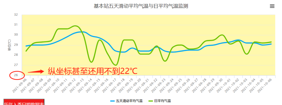 按照氣候?qū)W標(biāo)準(zhǔn),當(dāng)五天滑動(dòng)平均氣溫≤22℃時(shí)才算入秋,并且以滿足條件的五天中首個(gè)日平均氣溫≤22℃那天作為入秋日。